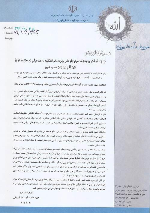 بدینوسیله به استحضار مردم متدین و انقلابی و رسانه های خبری می رساند گردهمایی روز ملی عفاف و حجاب در پارک ملت از سوی این حوزه علمیه برگزار میگردد و این حرکت فارغ از هرگونه سیاست زدگی سیاست بازان بوده و وابسته به هیچ یک از احزاب و جریان ها و خطوط سیاسی نیست بلکه حرکتی کاملا دینی و مذهبی در راستای تحقق احکام نورانی اسلام عزیز و جهت احیاء فرهنگ امر به معروف و نهی از منکر ، عفاف و حجاب و حل معضلات اجتماعی و فرهنگی در جامعه می باشد. امر به معروفی که ترک آن موجب نزول عذاب الهی برای امت اسلامی است و از مولای متقیان امیر المومنین ( ع ) مروی است : تمام کاری های نیک و جهاد در راه خدا در مقابل امر به معروف و نهی از منکر همچون قطره ای بر دریای پهناور است . ( نهج البلاغه ح ۴۰۷ )